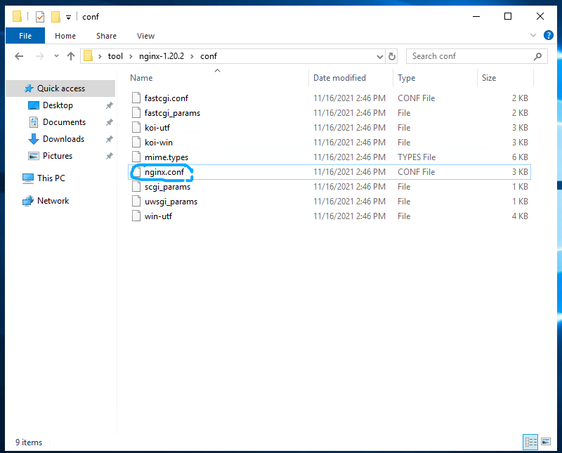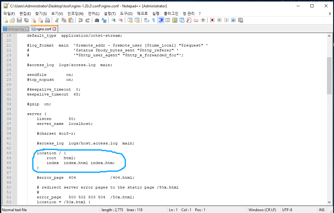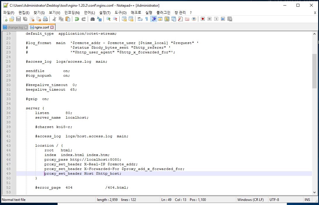 nginx가 설치된 경로(나의 경우는 (C:\Users\Administrator\Desktop\tool\nginx-1.20.2\conf)에서 conf폴더로 들어가 nginx.conf를 notepad앱을 연결하여 연다.