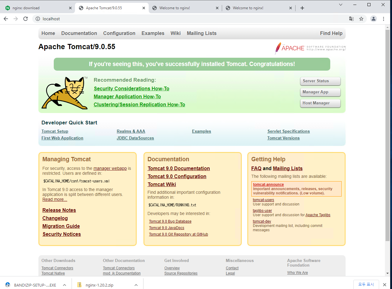 이제 브라우저에서 localhost:80으로 접속해서 톰캣 화면이 나오면 성공이다. 이전에는 nginx의 화면이 나왔지만 이제는 톰캣 화면이 나온다.