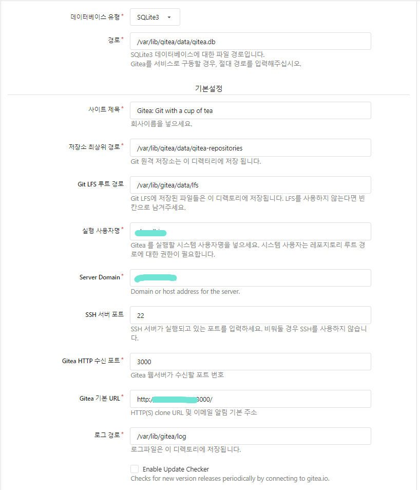DB는 따로 설치가 필요 없는 SQLite3을 택하였다.(Gitea는 데이터베이스 백엔드를 사용해야 한다고 한다.)