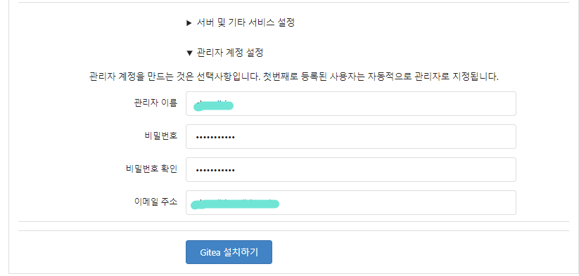 정보를 알맞게 입력 후 페이지 아래에서 관리자 계정을 설정한다.