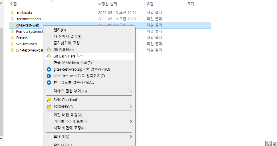 만약 Git Menu Here 메뉴가 없다면 로컬 pc에 깃이 설치되지 않은 것이다.